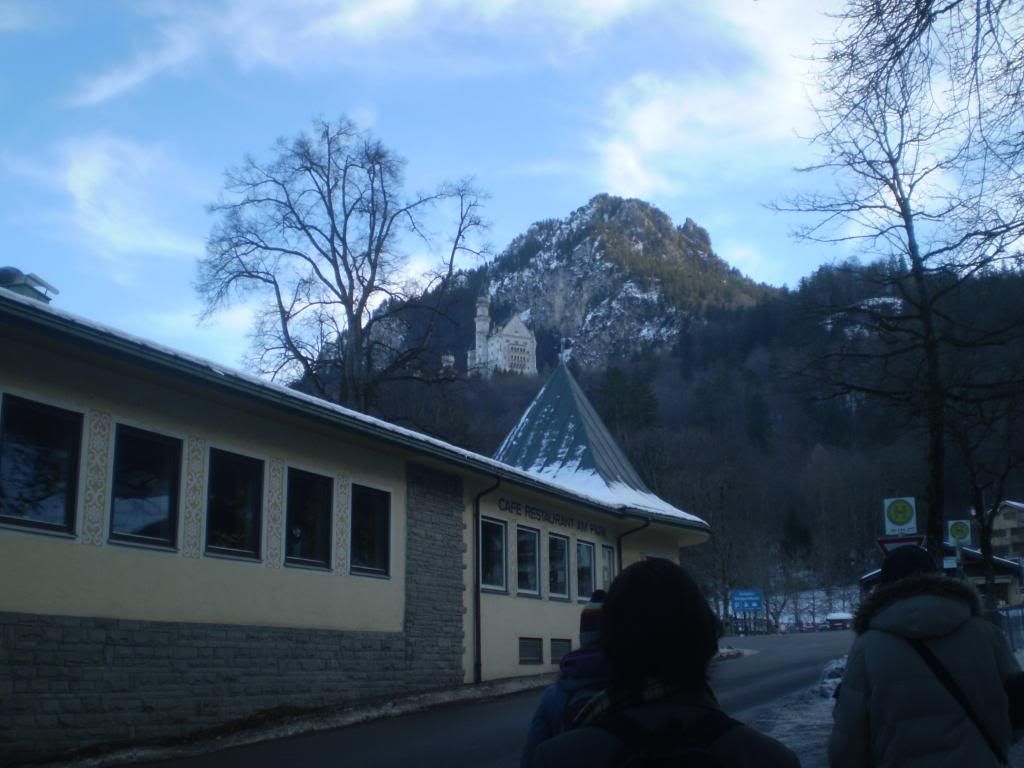 La entrada a la Maravilla. Nótese el castillo Neuschwanstein al fondo. En imagen, también: un protagonista y dos acompañantes, Bridget y Tyler, que de paso encontramos.